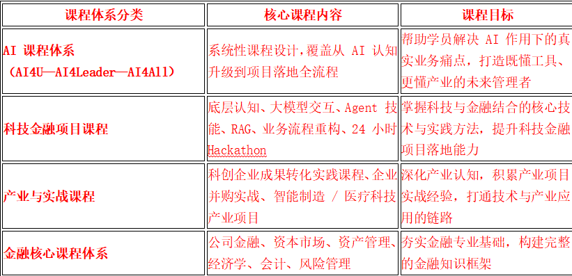 近年来,高金MBA在原有金融优势之上,系统升级课程框架,形成贯穿全程的 AI课程体系(AI4U—AI4Leader—AI4All)与科技金融项目式课程,帮助学生掌握大模型、智能体(Agent)、RAG、行业产业链分析、企业价值评估、科技成果转化、并购投融资等面向未来的核心能力,实现从“会用工具”到“理解原理”“推动落地”的能力跃迁。