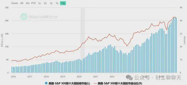 更可怕的是,这69.7万亿美元中,英伟达、谷歌、苹果、微软和亚马逊五大巨头加起来就达到了17.5万亿美元,几乎与中国GDP相当,而前10大公司总市值,更是接近25万亿美元,前20大公司的总市值则超过31万亿美元——美股历史上,从未有过少数公司市值占比如此集中的时刻。