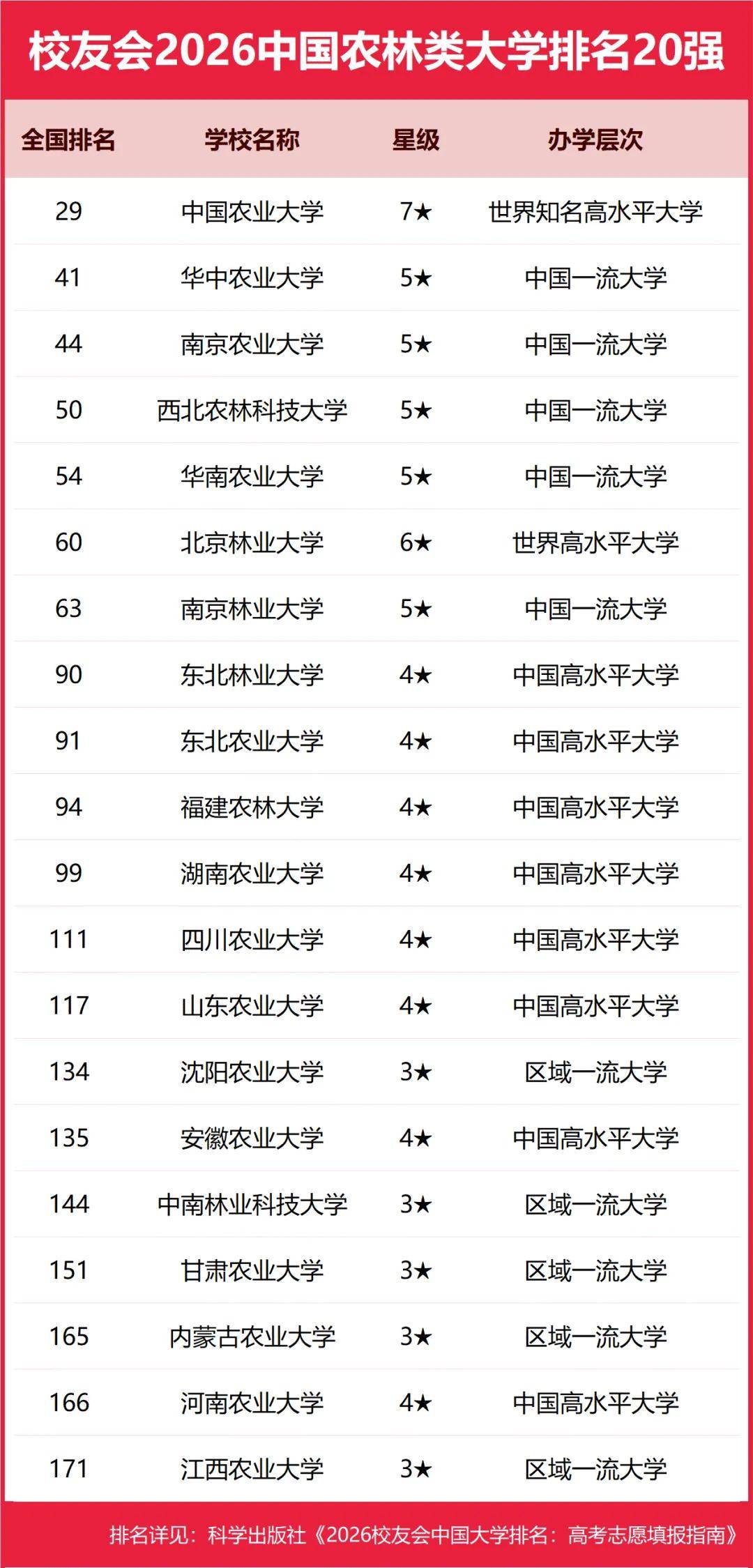 校友会2026中国农林类大学排名,中国农业大学、华南农业大学珠江学院、新疆农业职业技术大学、江苏农林职业技术学院第一