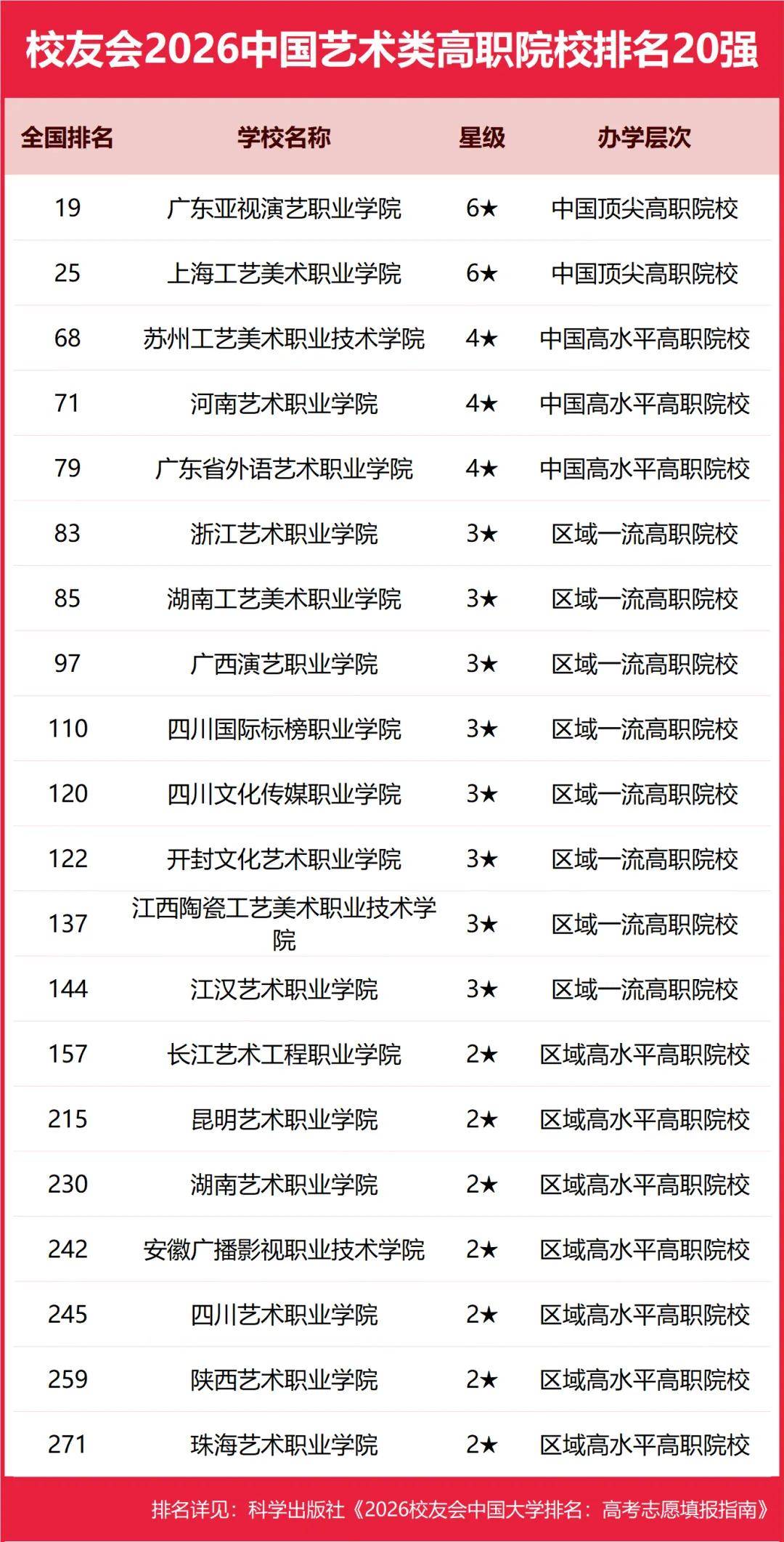 在校友会2026中国各类型高职院校排名中,江西应用技术职业学院问鼎理工类高职院校排名第一,合肥职业技术学院雄居综合类高职院校排名榜首,浙江金融职业学院荣登财经类高职院校排名首位,广东亚视演艺职业学院问鼎艺术类高职院校排名第一,山东医学高等专科学校稳居医药类高职院校排名第一,江苏农林职业技术学院雄居农林类高职院校排名第一,郑州体育职业学院雄居体育类高职院校排名第一,铜仁幼儿师范高等专科学校雄居师范类高职院校排名第一,湖南民族职业学院雄居民族类高职院校排名第一,河北政法职业学院雄居政法类高职院校排名第一,武汉外语外事职业学院跃居语言类高职院校排名冠军。