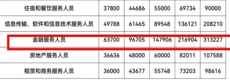 江苏省的数据显示,金融服务人员以分位值90%313,227元排在第一位。