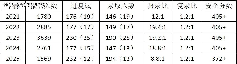 复录比的线,刷人集中在低分段。从目前的数据看,绝对安全分数段是在405+,此分数段基本无淘汰风险。25年是5年中要求最低的一年,安全分是372+,不过备考目标建议是定在390+,这个分数在25年之前录取率基本在80%以上,可应对触底反弹的风险。