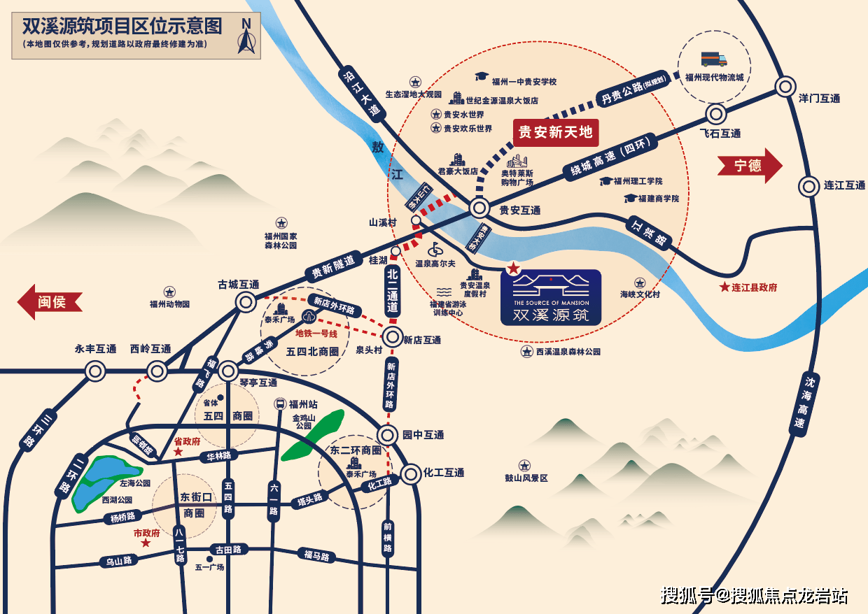 项目位于福州北贵安温泉旅游度假区核心位置,紧临福州第二母亲河敖江与乾头河,观山亲水,环境优美、空气清晰舒适,温泉资源优质丰富