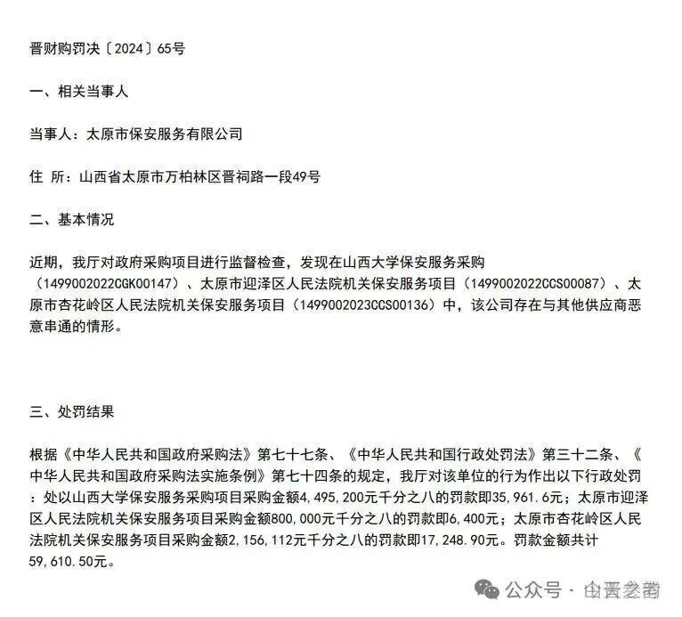本网查询财政厅相关文件,发现2024年财政厅确实就太原保安公司相关违规问题进行处罚。