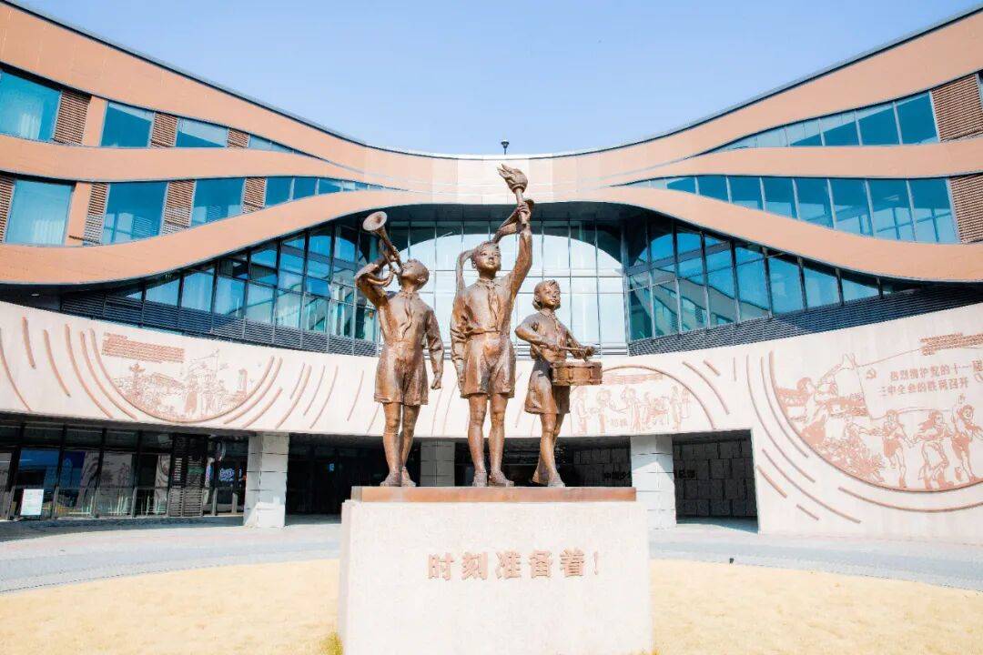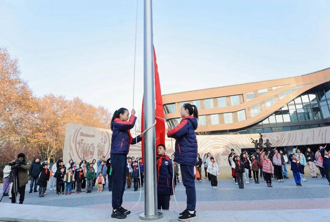 升国旗仪式:在杭州青少年活动中心红领巾广场举行升旗仪式,少先队员佩戴红领巾,进行庄严的升旗仪式。
