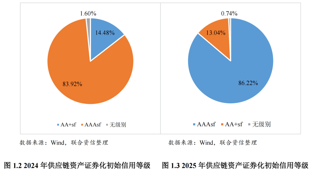 从初始信用等级来看,2025年发行的供应链资产证券化产品中,AAAsf产品发行规模占比为86.22%,同比上升2.30个百分点;AA+sf产品发行规模占比为13.04%,同比下降1.44个百分点。
