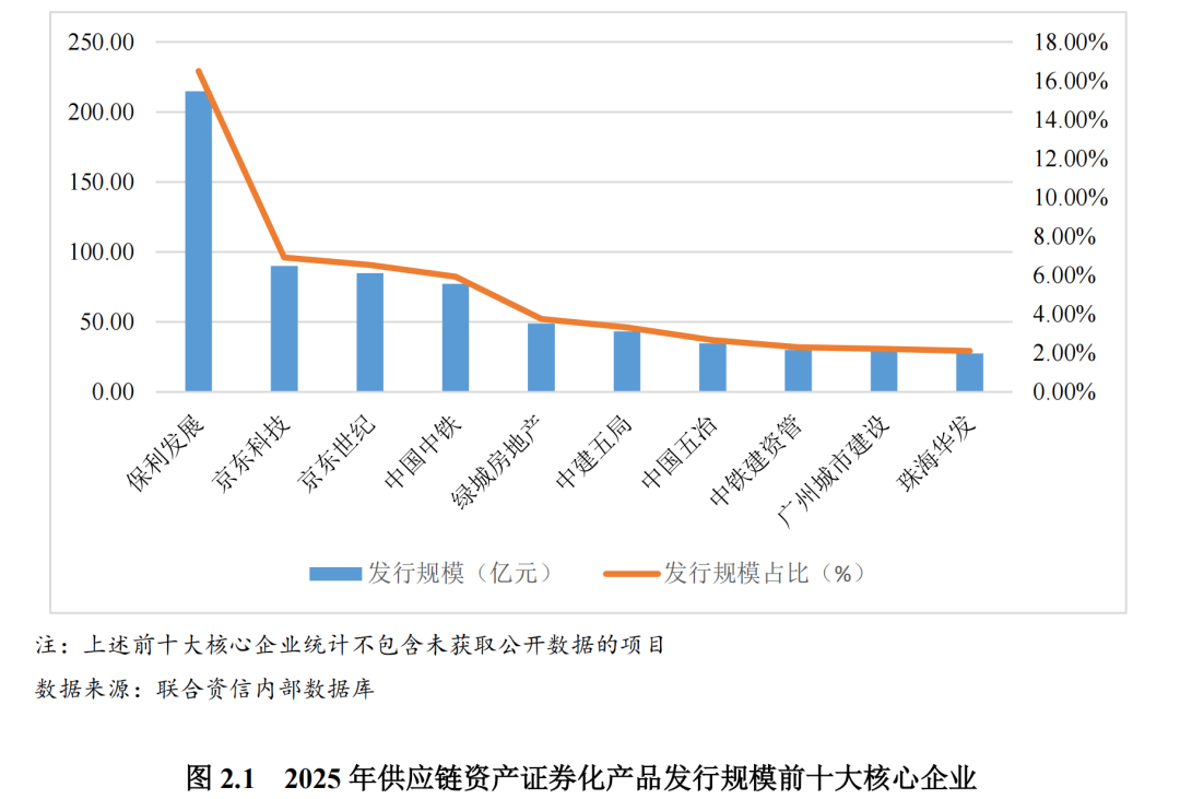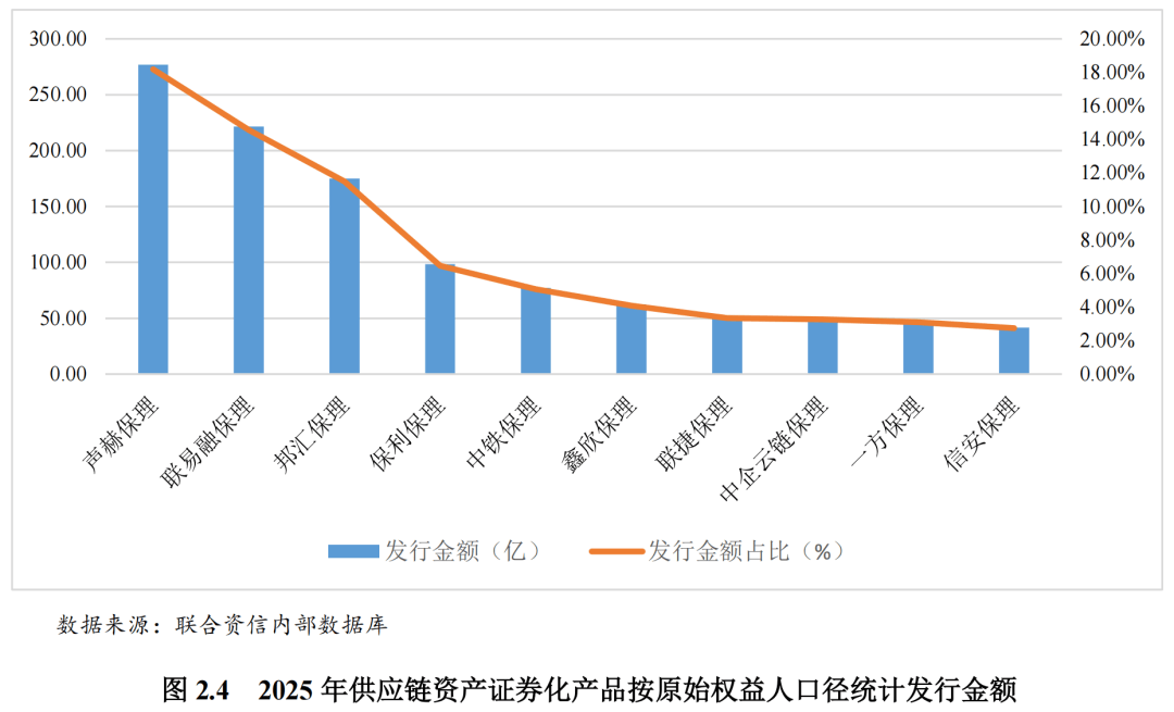 2025年发行的供应链资产证券化产品原始权益人较集中,前十大原始权益人发行金额占比为72.32%。