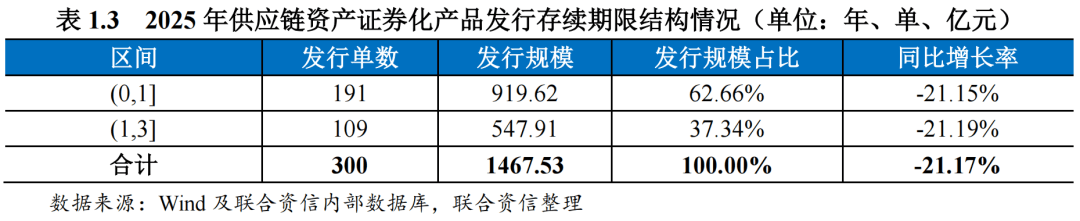 从发行存续期限结构来看,2025年发行的供应链资产证券化产品存续期限仍以1年及以内为主,各期限产品发行规模同比均有所下降,整体期限结构保持相对稳定。在市场风险偏好偏谨慎的环境下,产品期限设置仍以短久期、流动性优先为主要特征。