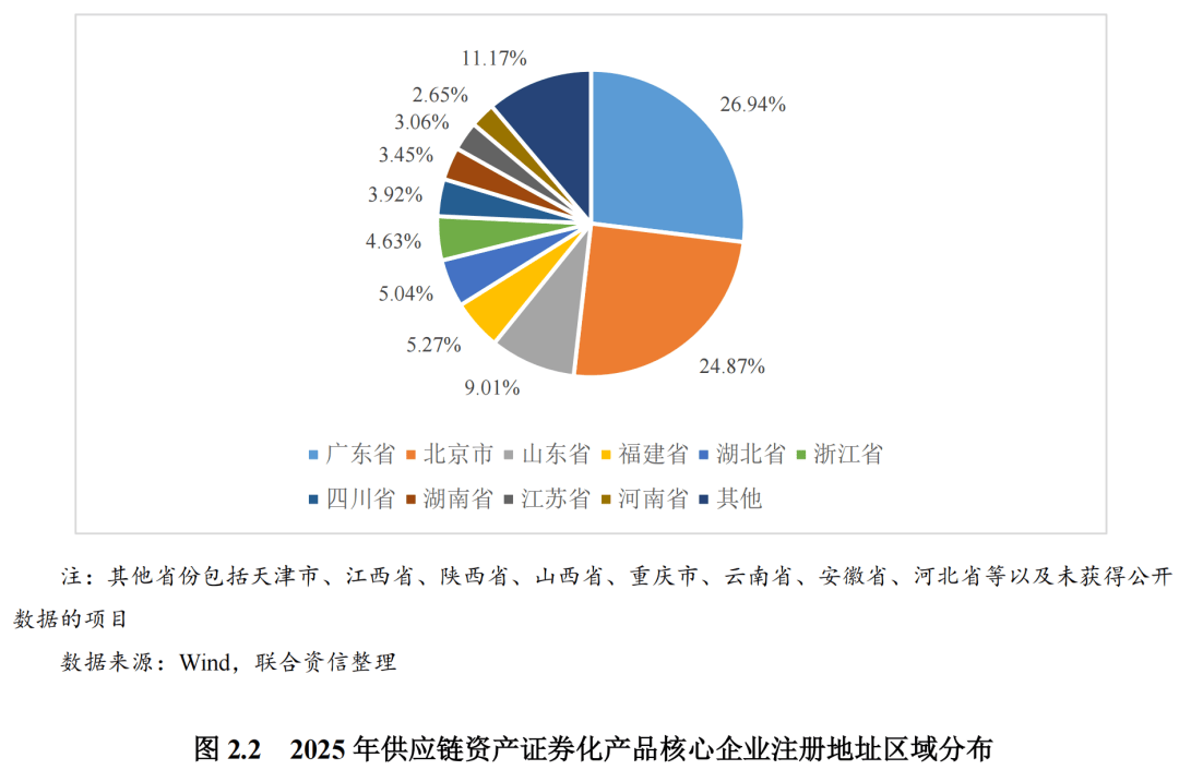 2025年发行的供应链资产证券化产品发行规模前十大单一核心企业集中度较高,且以国有企业为主。其中,北京市、广东省和山东省的核心企业发行金额占比大,核心企业主要集中在工业、房地产业和金融业。