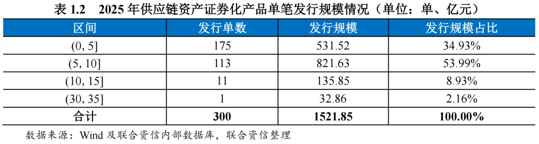 从产品规模分布来看,2025年发行的供应链资产证券化产品中,“中信证券-中企云链-中建五局1期供应链资产支持专项计划(中小微企业融资支持)”发行规模最大,为32.86亿元;“厦门象屿金象控股集团有限公司2025年度第一期供应链票据定向资产支持商业票据”发行规模最小,为0.25亿元。单笔发行规模在(0,5]亿元区间内的产品发行单数最多,单笔发行规模在(5,10]亿元区间内的产品合计发行规模最大。
