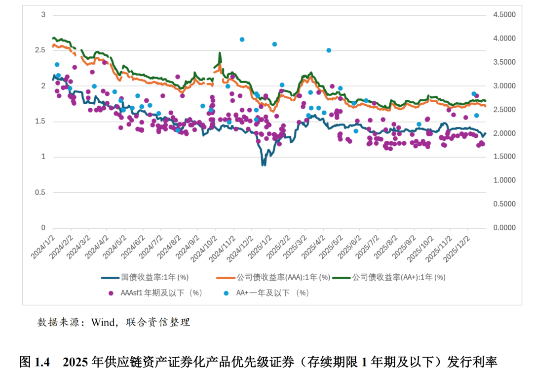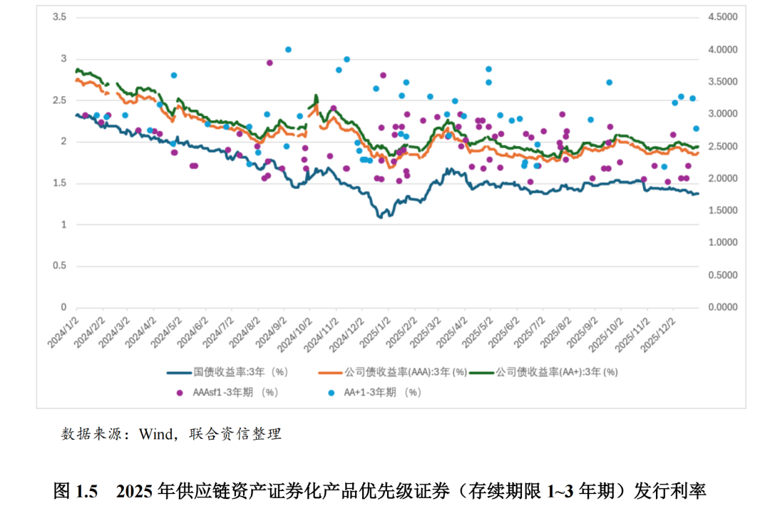 受持续的宽松的货币政策和流动性环境影响,2025年,供应链资产证券化产品发行利率整体较2024年有所下降且表现更平稳,不同存续期限的优先级证券与国债和公司债的发行利差均有所下降。其中存续期较长的优先级证券发行利率和发行利差的下降幅度更大,长期资金配置需求有所上升。不同信用等级的优先级证券的发行利差有所收窄。