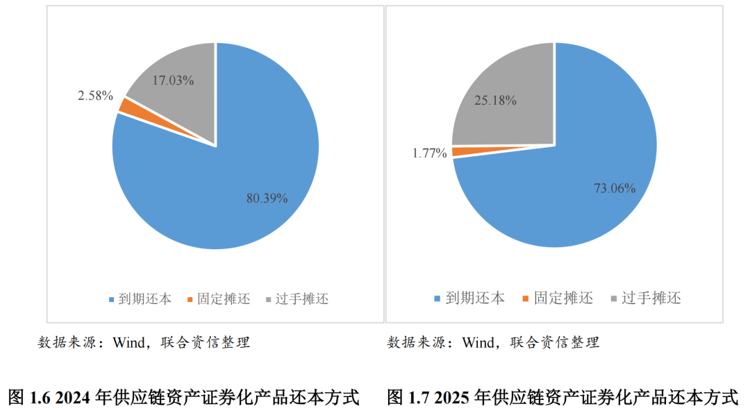 还本方式方面,2025年发行的供应链资产证券化产品仍以到期一次性还本为主,较2024年未发生重大变化。