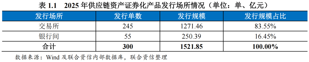 从发行场所来看,2025年,交易所供应链资产证券化产品发行规模合计为1271.46亿元,同比下降9.67%;发行单数合计245单,同比下降7.20%。银行间供应链资产证券化产品发行规模合计为250.39亿元,同比下降42.41%;发行单数合计55单,同比下降33.73%,主要系地产类、贸易类供应链资产证券化产品下降以及部分融资需求向交易所市场转移所致。