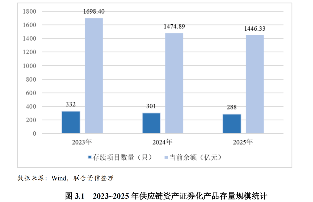 截至2025年底,供应链资产证券化产品市场存量规模1446.33亿元,占ABS全市场存续余额的4.04%。整体来看,供应链资产证券化产品市场的存续只数逐年降低,存量规模逐年下降。