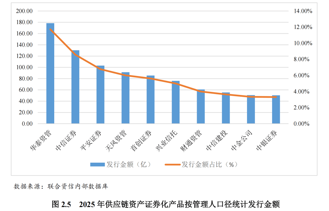 2025年发行的供应链资产证券化产品发行管理人集中,前十大管理人发行金额占比为57.97%。