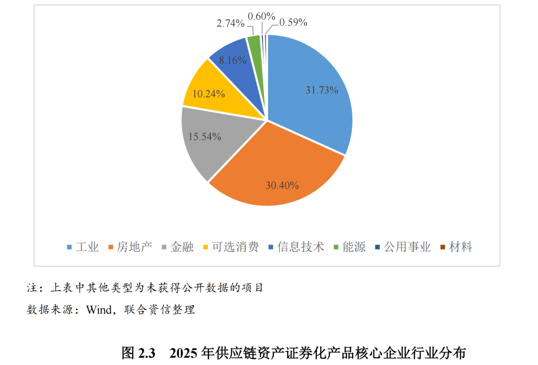 从核心企业的行业分布来看,2025年发行的供应链资产证券化产品对应单一核心企业主要分布于8大行业,其中工业、房地产和金融业对应金额发行规模领先,分别为413.11亿元、395.72亿元和202.33亿元,占单一核心企业发行金额比重分别为31.73%、30.40%和15.54%。