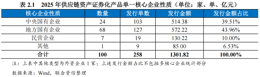 从核心企业的企业性质分布来看,2025年发行的300单单一核心企业供应链资产证券化产品涉及的核心企业包括国有企业92家、民营企业7家、其他1家,对应发行规模分别为514.38亿元、572.22亿元和85.00亿元。