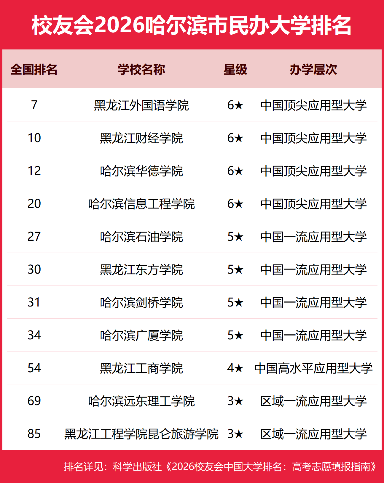 在校友会2026中国民办大学排名中,黑龙江外国语学院全国排名第7名,雄居校友会2026哈尔滨市民办大学排名第一。黑龙江财经学院第2,哈尔滨华德学院第3。名列前10名的其他民办院校为哈尔滨信息工程学院、哈尔滨石油学院、黑龙江东方学院、哈尔滨剑桥学院、哈尔滨广厦学院、黑龙江工商学院、哈尔滨远东理工学院。