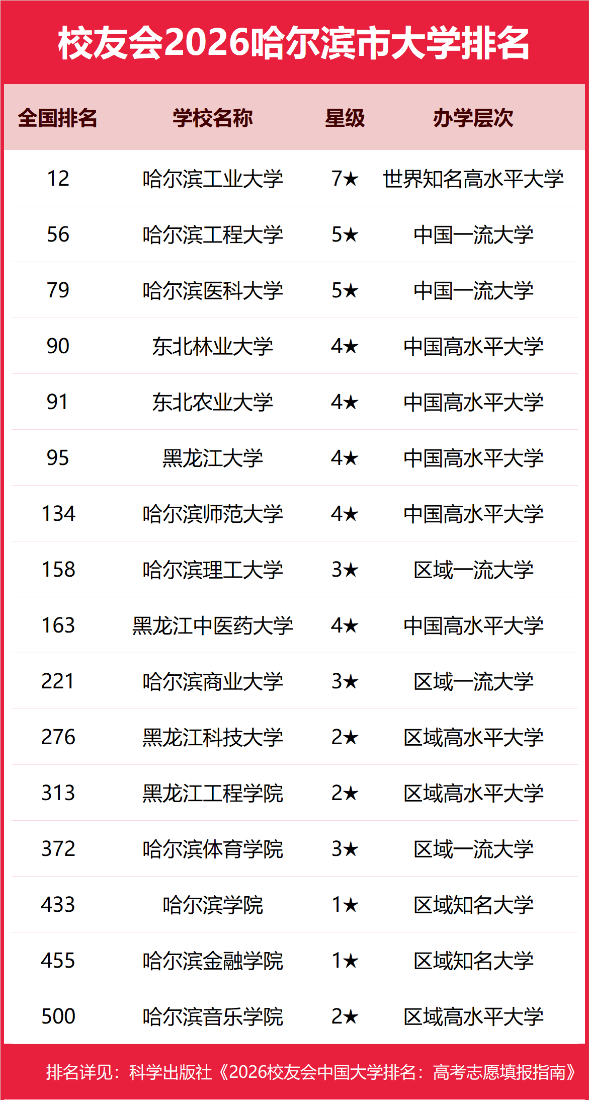 在校友会2026中国大学排名中哈尔滨工业大学全国排名第12,雄居校友会2026哈尔滨市大学排名第一。哈尔滨工程大学第2,哈尔滨医科大学第3。名列前10名的其他院校为东北林业大学、东北农业大学、黑龙江大学、哈尔滨师范大学、哈尔滨理工大学、黑龙江中医药大学、哈尔滨商业大学。