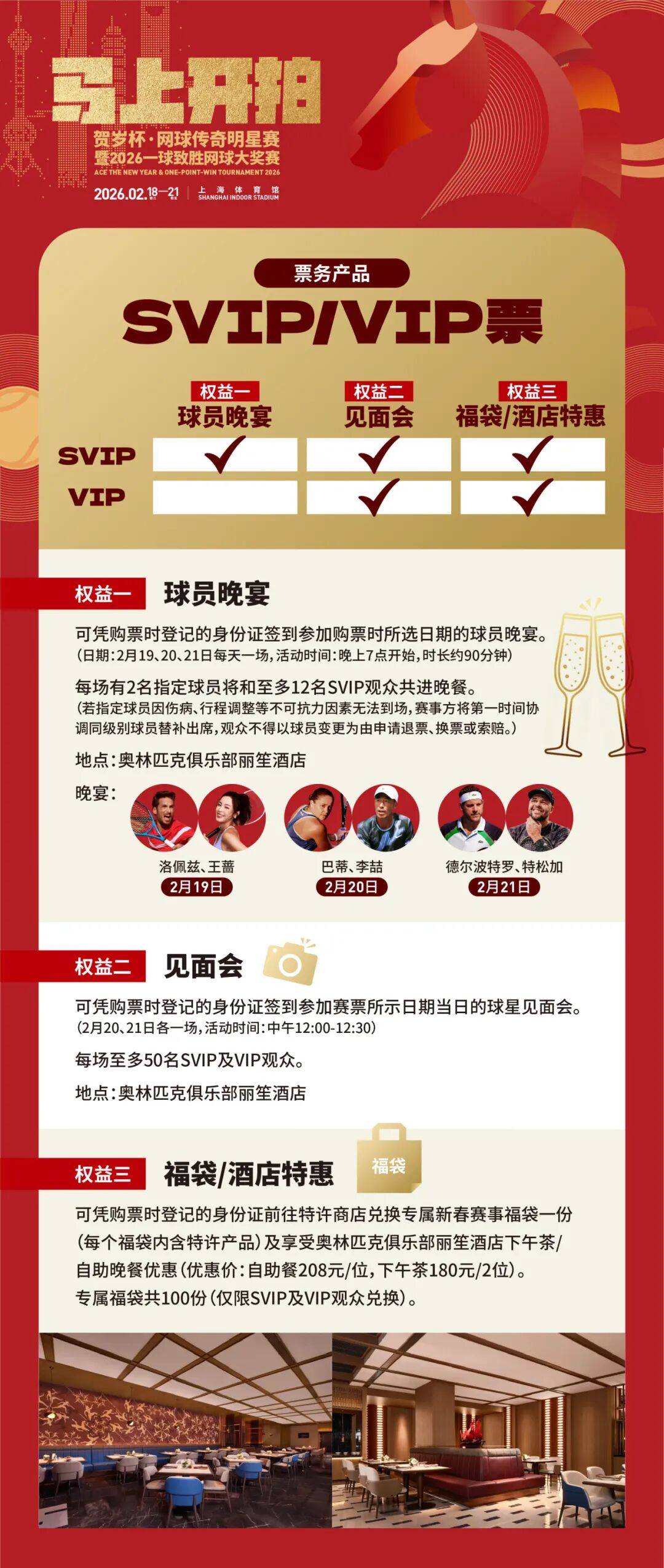 此外,购买SVIP/VIP票的观众则可获得独家赛事礼遇,解锁专属晚宴、签名合影、周边福袋及高端餐饮等赛场内外定制体验。