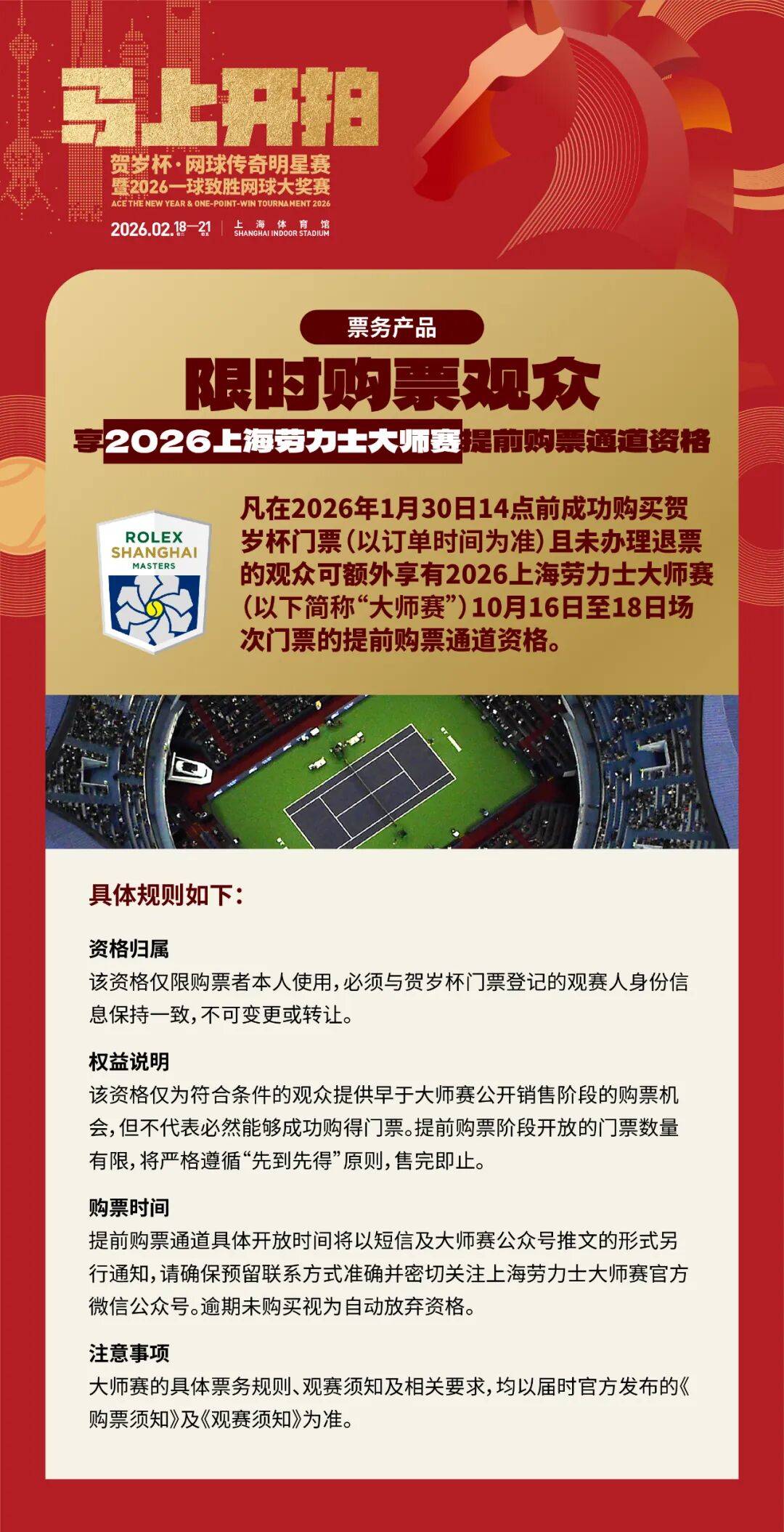 凡在1月30日14点前,成功购买“贺岁杯”任意赛票或票务产品的观众,即可享有2026上海劳力士大师赛10月16日至18日场次门票的提前购票通道资格,享受春节直通十月顶级赛场的先人一步。