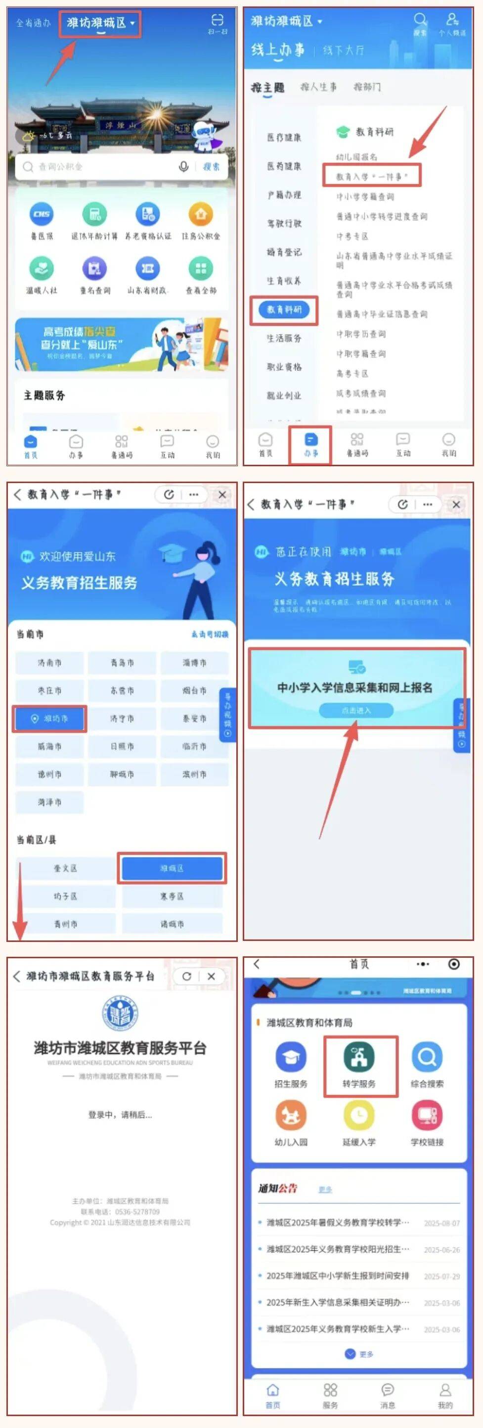 方式三:“爱山东”政务服务小程序:微信搜索“爱山东”政务服务小程序,进入后在搜索框输入“潍坊市潍城区教育服务平台”,点击搜索,通过服务进入“潍坊市潍城区教育服务平台”,选择“转学服务”,按照系统提示操作。