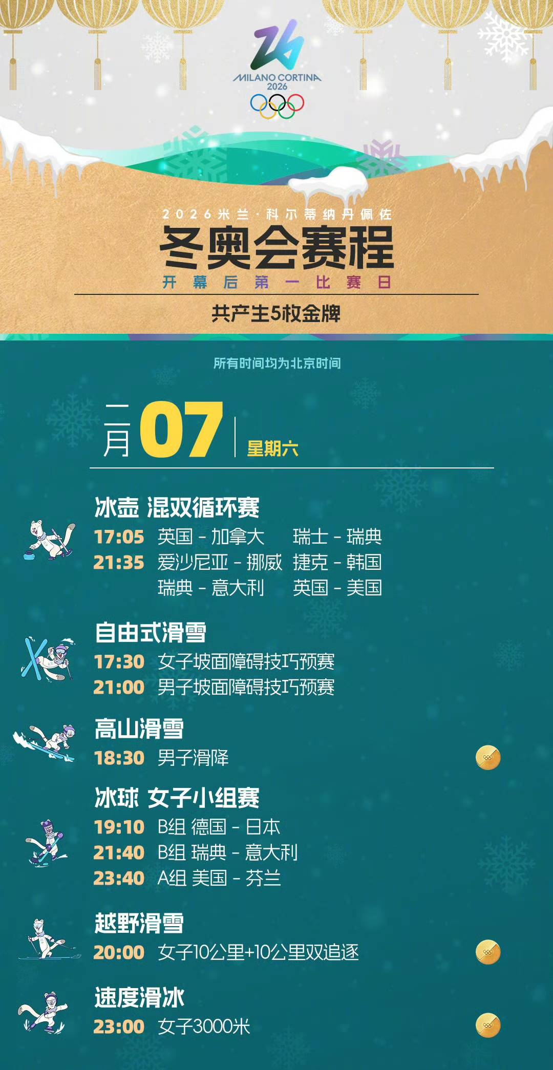 开幕式落幕,冬奥会正式进入奖牌角逐阶段,2月7日将迎来首个金牌日,共产生5枚金牌,多项热门赛事同步开赛: