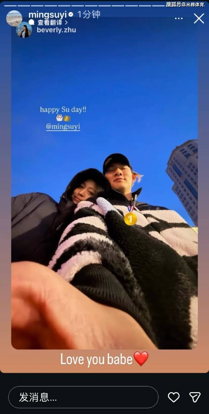 赛后,朱易晒出二人的甜蜜合照,她依偎在苏翊鸣肩头,小鸟依人,还给他加上了金牌的图标。朱易配文:“happy Su day!”